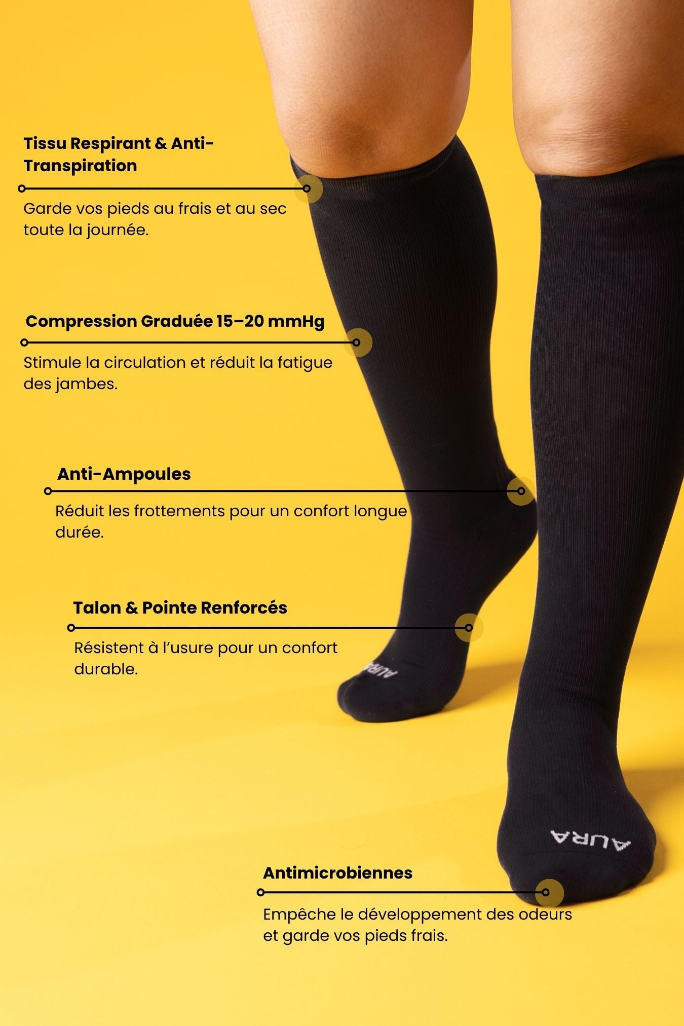 Ressentez la différence : un tissu respirant et une compression douce qui gardent vos jambes légères du matin au soir.